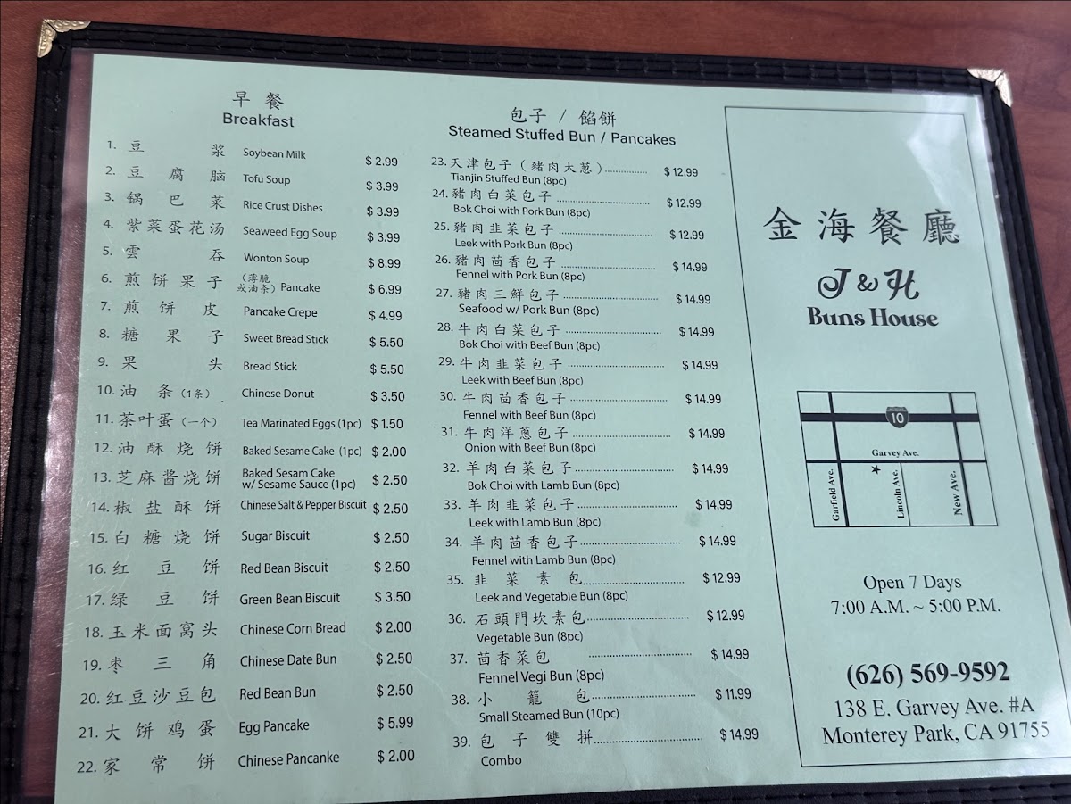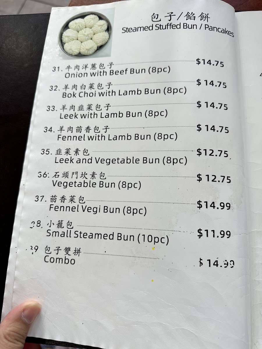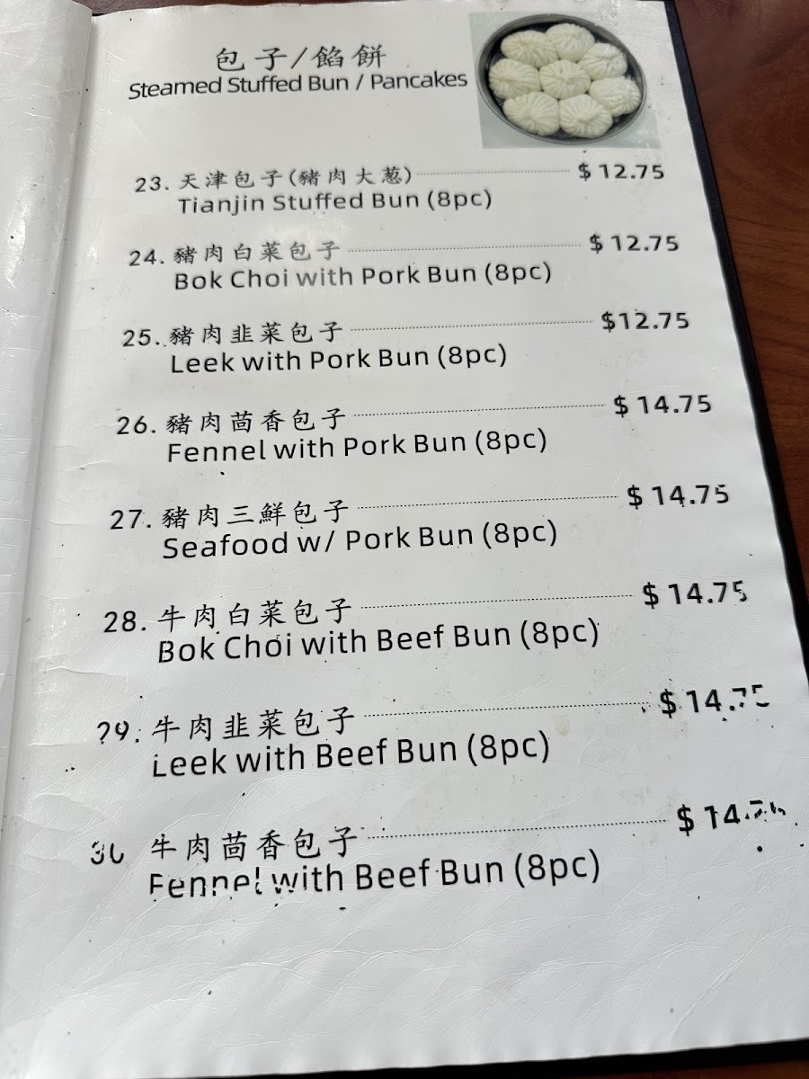 Steamed stuffed buns are available in multiple flavors, typically offered in sets of eight pieces. The pancake section includes options such as the Chinese green onion pancake and fried shredded pancake with meat. Dumplings and fried leek dumplings are also part of the menu, often paired with soups like tofu soup or seaweed egg soup.