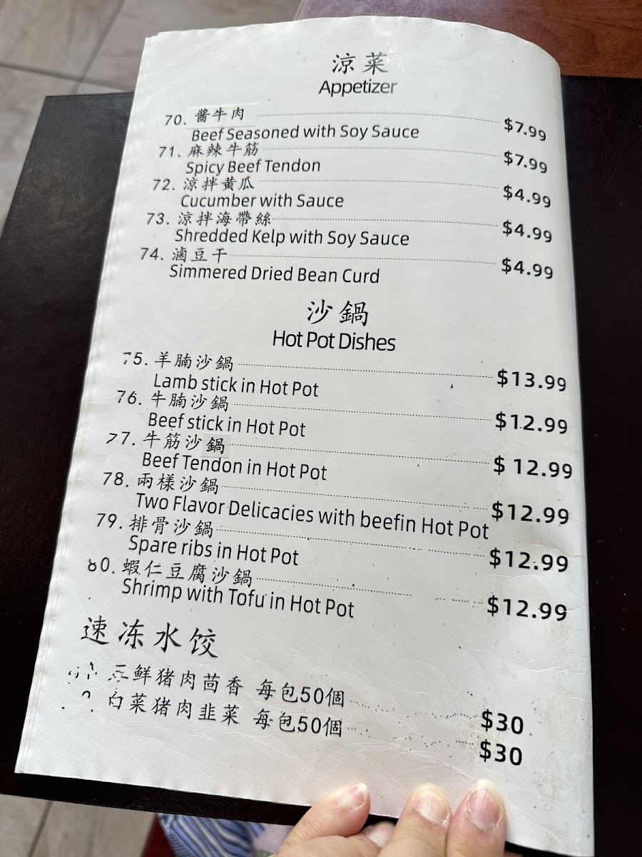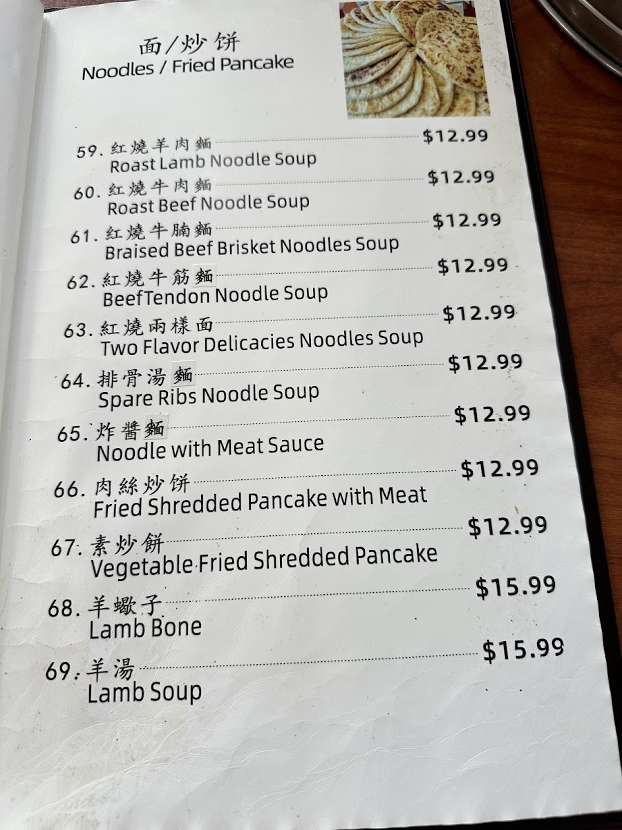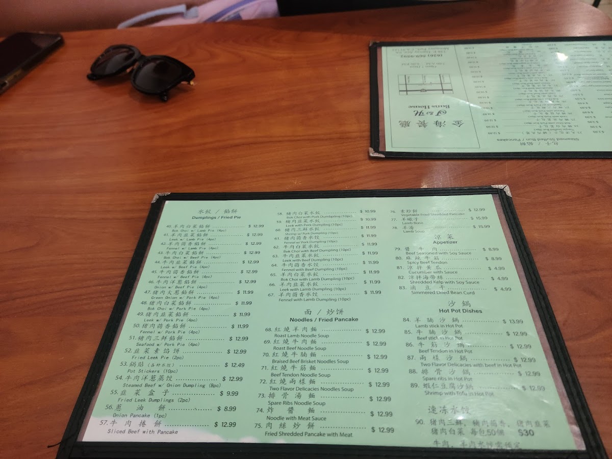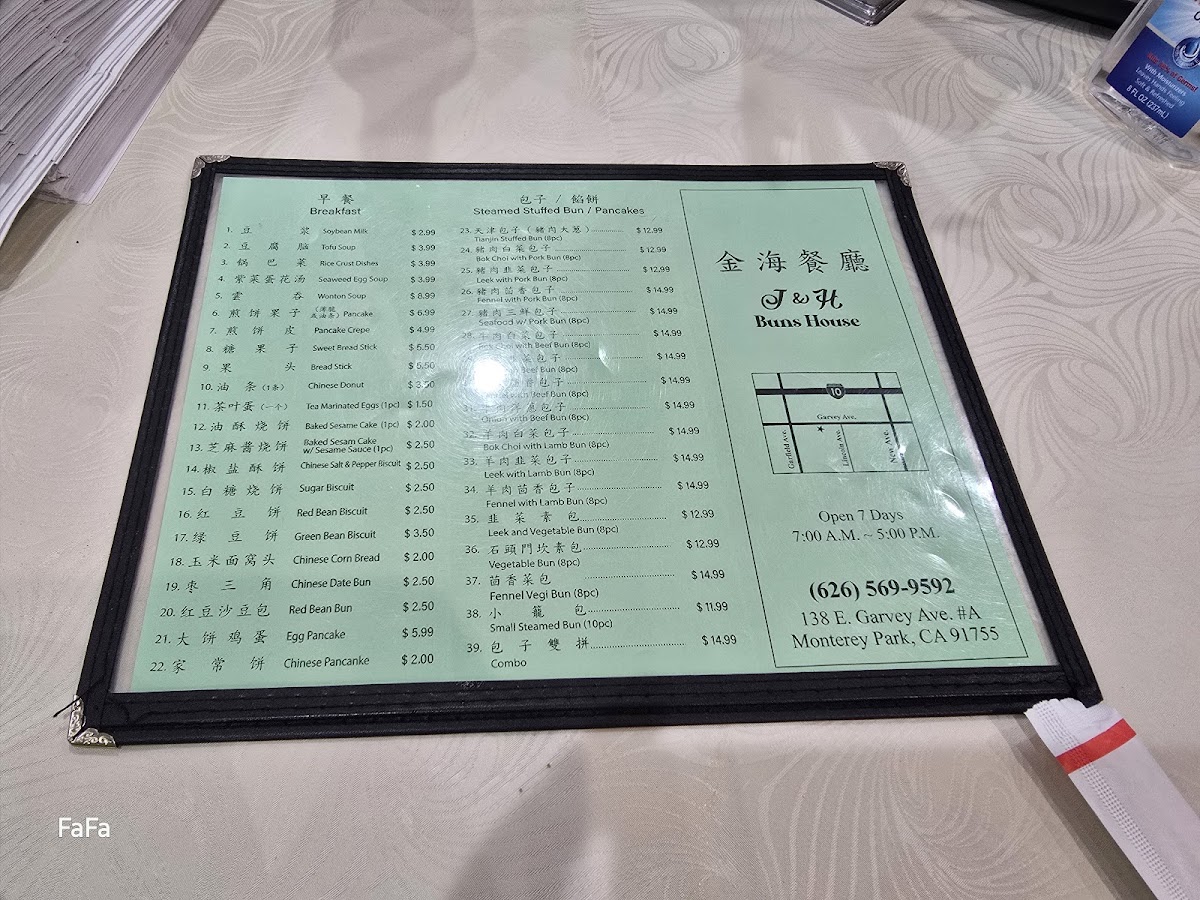 Steamed stuffed buns are available in multiple flavors, typically offered in sets of eight pieces. The pancake section includes options such as the Chinese green onion pancake and fried shredded pancake with meat. Dumplings and fried leek dumplings are also part of the menu, often paired with soups like tofu soup or seaweed egg soup.